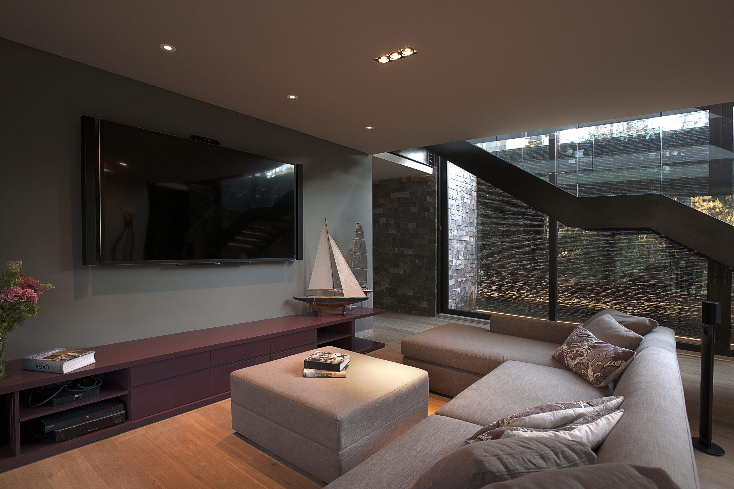 Each villa is developed across three levels, comprising parking and bedroom areas, with the public spaces—TV room, kitchen, living and dining room—located on a split level that opens onto an interior garden positioned a story and a half above street level. This spatial configuration allows the home to adapt naturally to the steep terrain, offering the bedrooms sweeping views of the green ravine in front, while the side-facing forest becomes an integral visual element of the private, inward-facing garden.