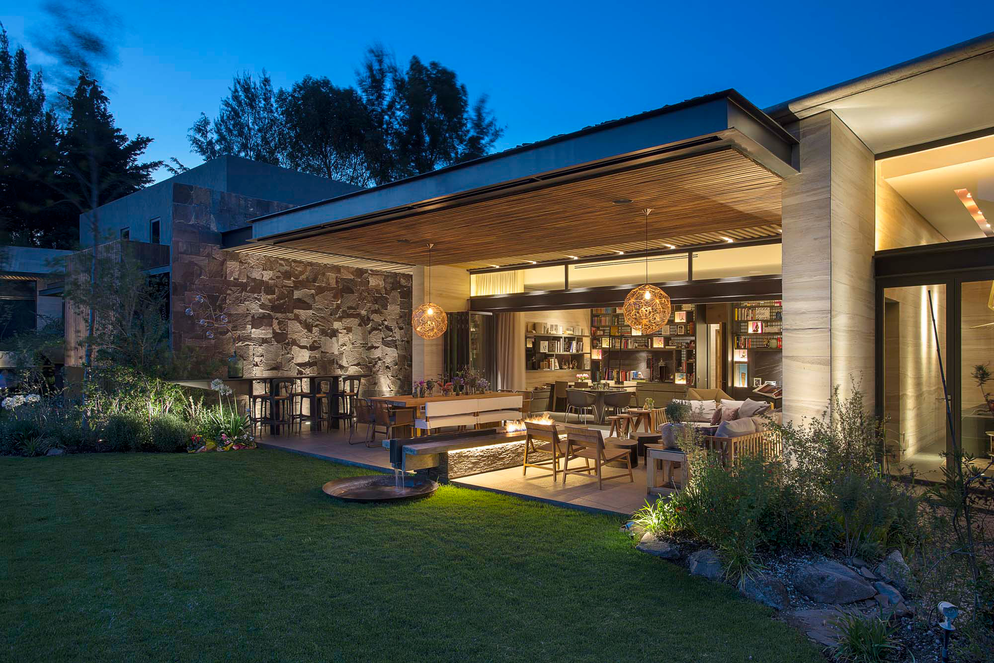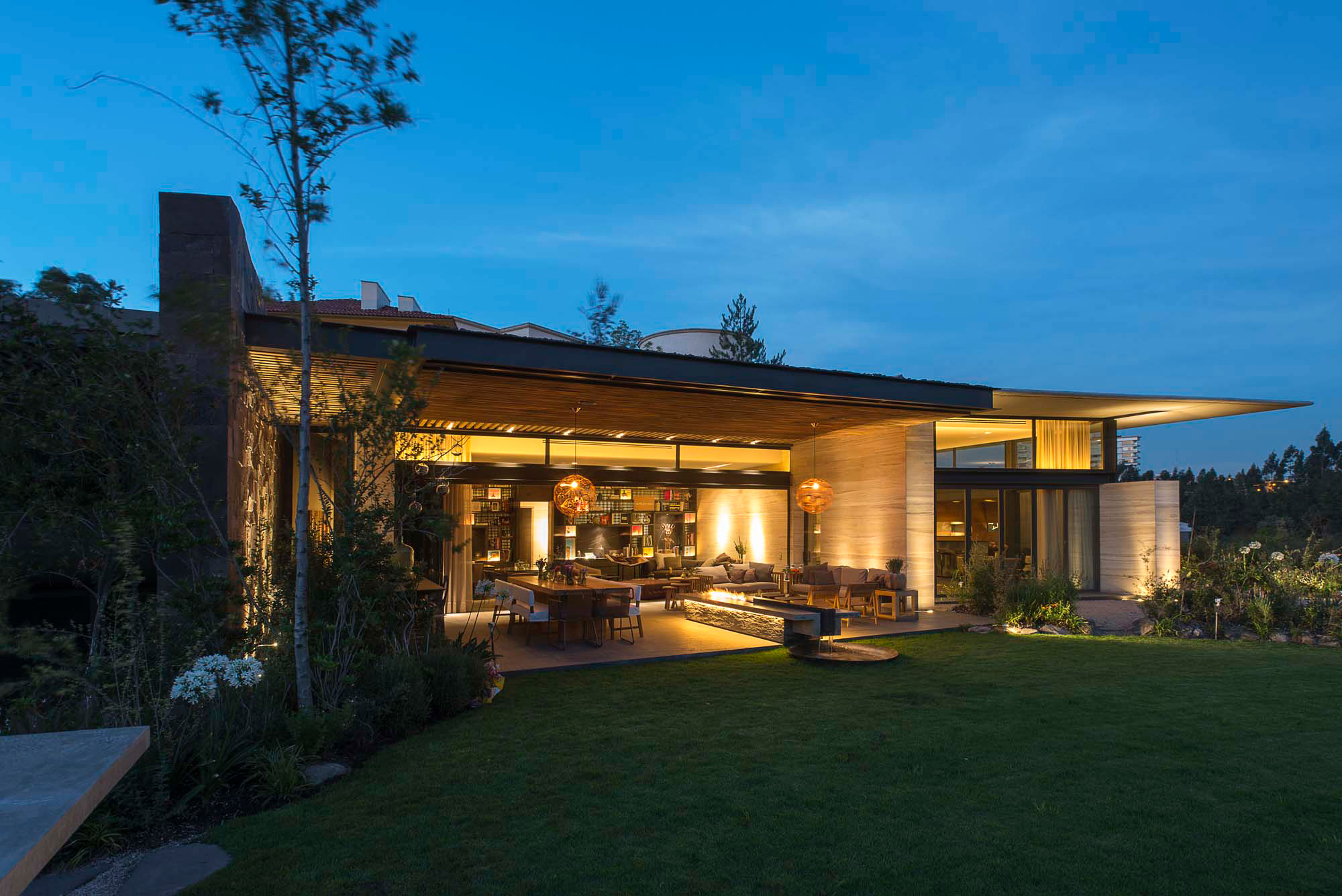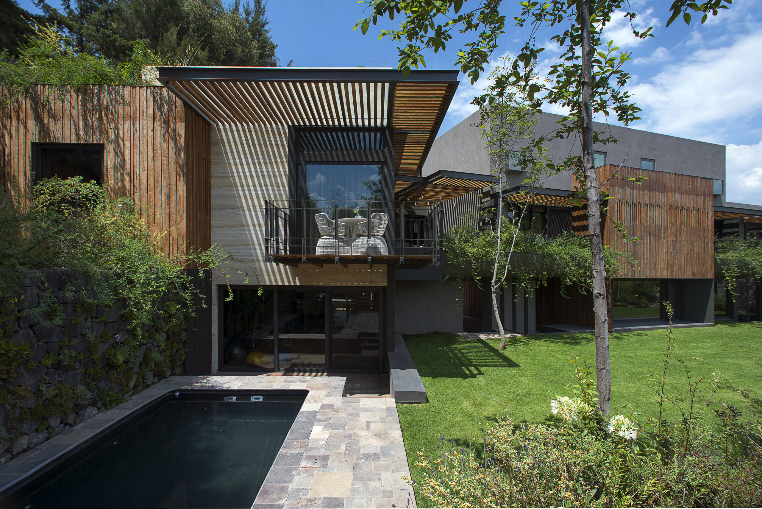 El desarrollo de la casa se puede apreciar claramente en la interacción de estos diferentes espacios, que están vinculados desde la entrada principal de la casa fluyendo desde el pasillo hasta la galería; las líneas otorgadas por el material a lo largo de la pared hacen la transición de un espacio a otro de forma natural desde el pasillo a la sala y después hacia el comedor y la cocina. Lo mismo sucede en la terraza familiar y las conexiones entre la sala familiar, terrazas y jardines.