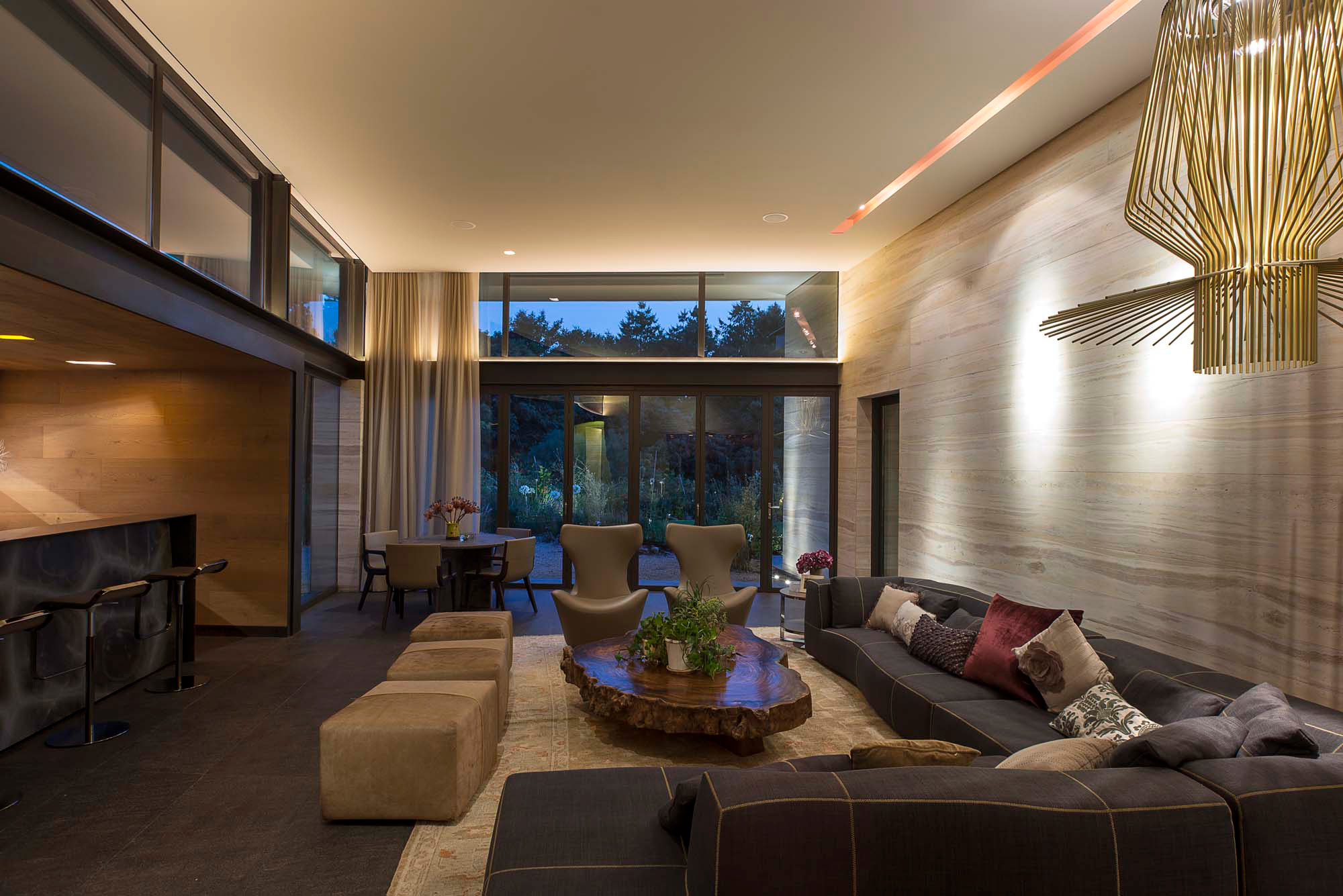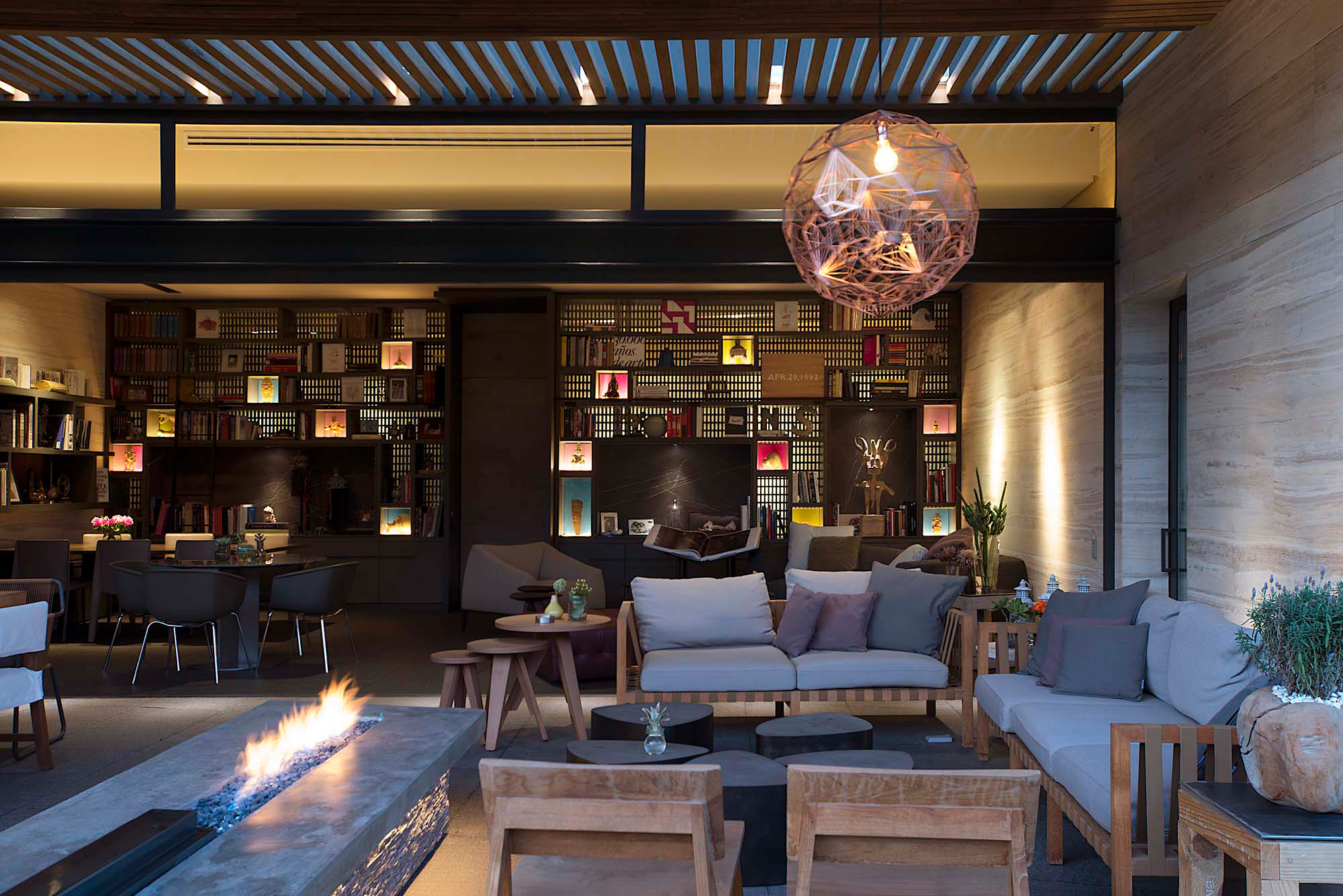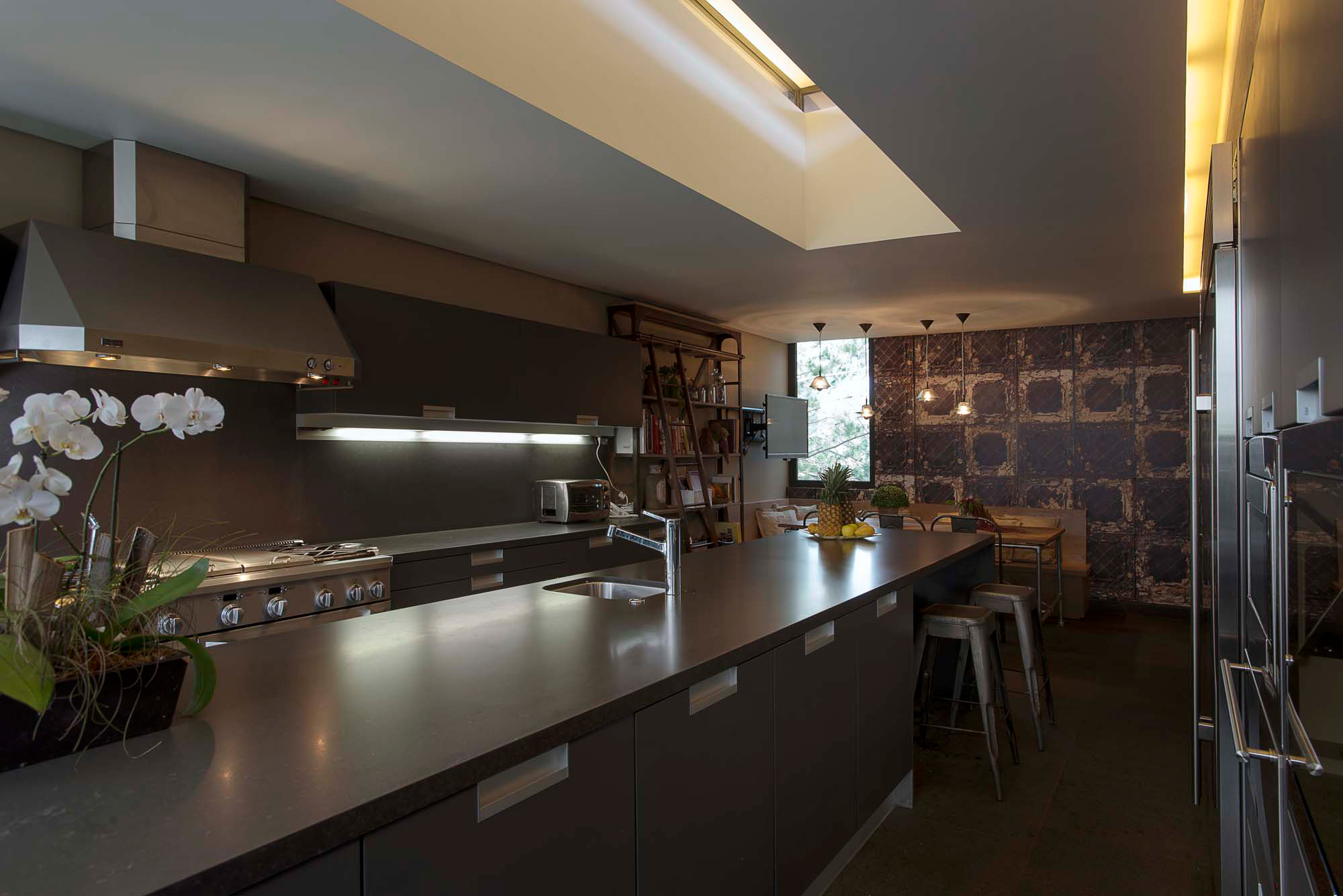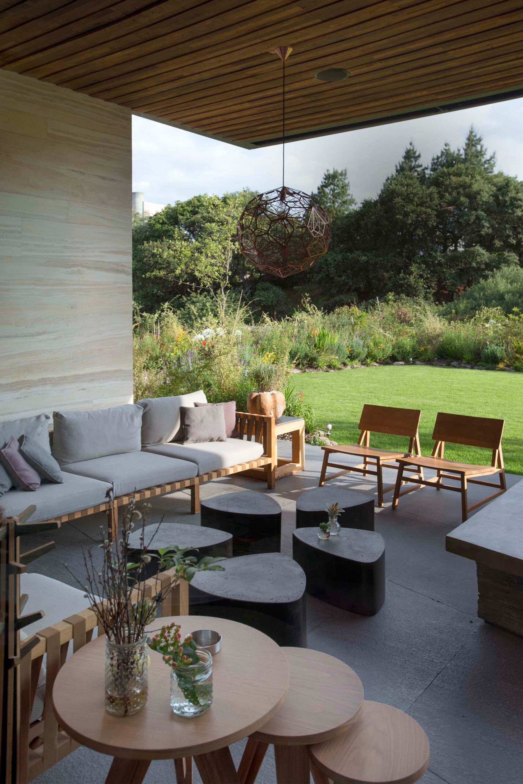 El desarrollo de la casa se puede apreciar claramente en la interacción de estos diferentes espacios, que están vinculados desde la entrada principal de la casa fluyendo desde el pasillo hasta la galería; las líneas otorgadas por el material a lo largo de la pared hacen la transición de un espacio a otro de forma natural desde el pasillo a la sala y después hacia el comedor y la cocina. Lo mismo sucede en la terraza familiar y las conexiones entre la sala familiar, terrazas y jardines.